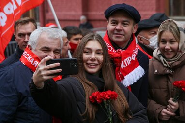 Заместители председателя ЦК КПРФ Дмитрий Новиков (слева) и Владимир Кашин во время возложения венков и цветов к Мавзолею Ленина на Красной площади в день 103-й годовщины со дня основания ВЛКСМ.