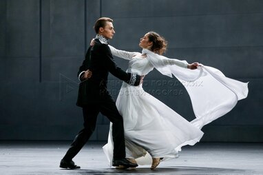 Актеры Юрий Поляк в роли Андрея Болконского и Ксения Трейстер в роли Наташи Ростовой во время предпоказа спектакля «Война и мир» режиссера Римаса Туминаса по мотивам произведения Льва Толстого на Большой сцене Государственного академического театра имени Евгения Вахтангова.