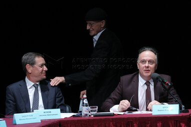 Депутат Госдумы РФ Александр Жуков (слева), директор Театра имени Евгения Вахтангова Кирилл Крок (справа) и художественный руководитель Театра имени Вахтангова, режиссер Римас Туминас (на втором плане) во время итогового заседания оргкомитета на новой сцене Театра имени Вахтангова для подведения итогов реализации плана основных мероприятий.