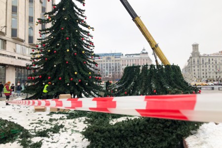 Установка новогодних елок рядом с совмещенным вестибюлем станций «Тверская» и «Пушкинская» Московского метрополитена.