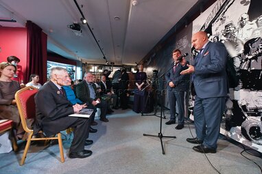 Фронтовик Николай Орлов (по центру) и автор книги «Советские партизаны в Италии» Массимо Эккли во время вручения награды Итальянского движения Сопротивления - медали «Гарибальдийская звезда» (или медаль «Гарибальди») - 96-летнему советскому фронтовику Николаю Орлову в преддверии Дня Героев Отечества в Красногорском филиале Музея Победы.