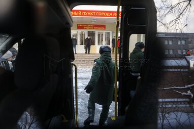 Сборный пункт военного комиссариата Москвы, откуда будут отправлены призывники в научные роты Вооруженных сил РФ.