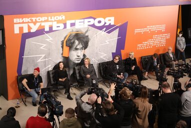 Пресс-конференция и выставка-байопик «Виктор Цой. Путь героя» в Центральном выставочном зале «Манеж» к 60-летию со дня рождения музыканта.