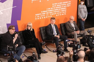 Автор концепции и куратор выставки Дмитрий Мишенин, автор идеи и продюсер выставки Александр Кармаев, автор текстов к выставке, французский дипломат и писатель, организатор гастролей российских музыкантов в Европе в 1980-е годы Жоэль Бастенэр, сокуратор, популяризатор советской рок-музыки в США в 1980-е – 1990-е годы Джоанна Стингрей и генеральный директор музейно-выставочного центра «Росизо» Ольга Галактионова (слева направо) во время пресс-конференции и выставки-байопик «Виктор Цой. Путь героя» в Центральном выставочном зале «Манеж» к 60-летию со дня рождения музыканта.