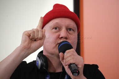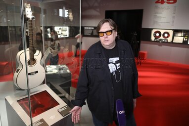 Автор идеи и продюсер выставки «Виктор Цой. Путь героя» Александр Кармаев во время пресс-конференции и выставки-байопик «Виктор Цой. Путь героя» в Центральном выставочном зале «Манеж» к 60-летию со дня рождения музыканта.