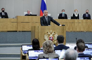 Председатель Государственной Думы Вячеслав Володин во время первого пленарного заседания весенней сессии Государственной думы 18 января 2022 года. Фото предоставлено пресс-службой нижней палаты парламента.
