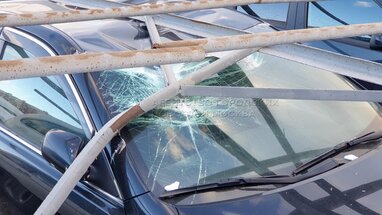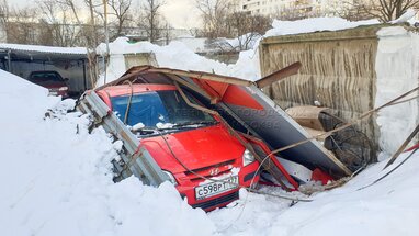 Последствия обрушения металлических конструкций на частной крытой автостоянке по адресу: ул. Прокатная, д. 5а. В результате падения навеса был поврежден 21 автомобиль.