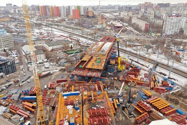 Вид с квадрокоптера на строительство участка Московского скоростного диаметра в районе Волгоградского проспекта.