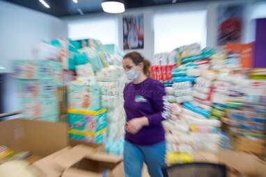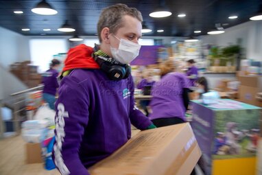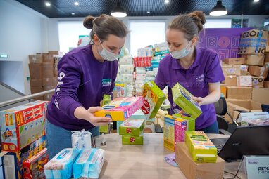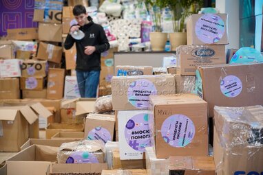 Штаб по сбору гуманитарной помощи от торговых сетей для семей из Донецкой и Луганской народных республик (ДНР и ЛНР) в штабе ресурсного центра «Мосволонтер» на Ленинградском проспекте.