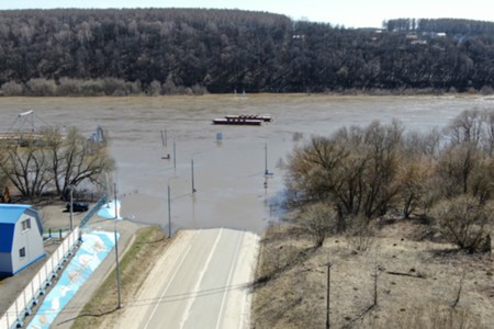 Вид с квадрокоптера на паводок на реке Оке в городском округе Озеры.