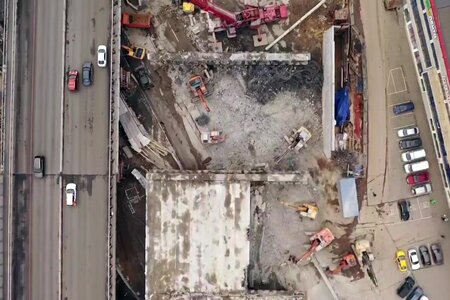 Вид с квадрокоптера на демонтаж Дмитровского путепровода на севере Москвы