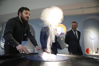 Руководитель Департамента культуры города Москвы Александр Кибовский (в центре) на презентации нового интерактивного пространства «Лунариум» в Московском планетарии.