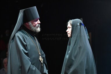 Актеры Александр Галибин в роли Агафангела и Татьяна Циренина в роли Херувимы во время показа спектакля «Ангелы вышли покурить» в театре «Школа современной пьесы».