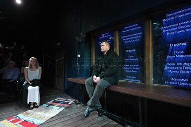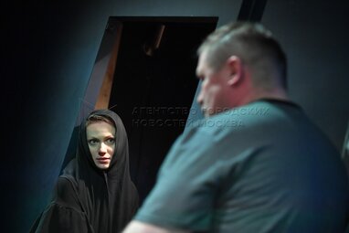 Актеры Иван Мамонов в роли Паши и Мария Раевская в роли Паломницы во время показа спектакля «Ангелы вышли покурить» в театре «Школа современной пьесы».