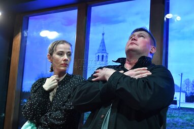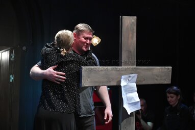 Актеры Александр Галибин в роли Агафангела и Ирина Линдт в роли Нины во время показа спектакля «Ангелы вышли покурить» в театре «Школа современной пьесы».