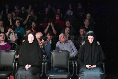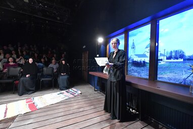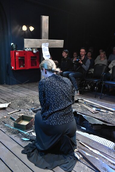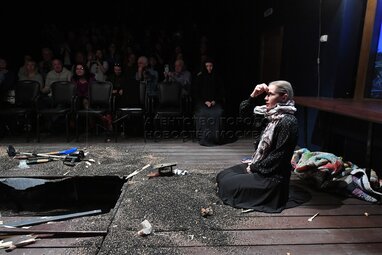 Актриса Мария Раевская в роли Паломницы во время показа спектакля «Ангелы вышли покурить» в театре «Школа современной пьесы».