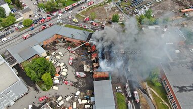 Вид с квадрокоптера на ликвидацию пожара в производственно-складском здании по адресу: ул. Котляковская, д. 8, стр. 3.