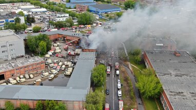 Вид с квадрокоптера на ликвидацию пожара в производственно-складском здании на юге Москвы