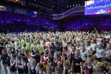 Мастер-класс Дины и Арины Авериных и Елизаветы Назаренковой на Всероссийском соревновательном марафоне в формате Гимнастрады «Здоровые дети - здоровая Россия» во Дворце гимнастики Ирины Винер-Усмановой.