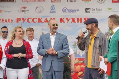 Организатор международного фестиваля «Русская кухня» Татьяна Федорова (слева) и актеры Владимир (в центре), Юрий (второй справа) Торсуевы во время конкурса на самый вкусный пельмень в рамках фестиваля «Русская кухня 2022» в культурно-развлекательном комплексе «Кремль в Измайлово».