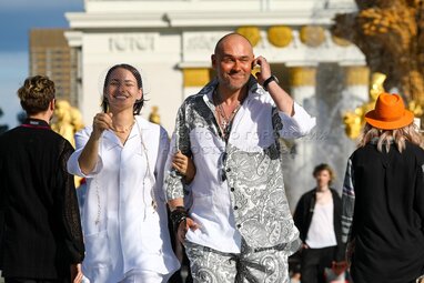 Актер Максим Аверин (справа) на показе коллекции Ivanova на ВДНХ в рамках Московской недели моды.