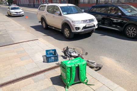 Последствия ДТП с участием внедорожника и курьера-велосипедиста в центре Москвы