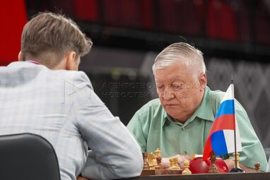 Многократный чемпион мира по шахматам, политик Анатолий Карпов (слева) и российский шахматист, гроссмейстер, двукратный чемпион России, чемпион Москвы Александр Морозевич (справа) во время турнира звезд на Международном шахматном форуме Moscow Open 2022 при поддержке столичного департамента спорта, во Дворце гимнастики Ирины Винер-Усмановой.