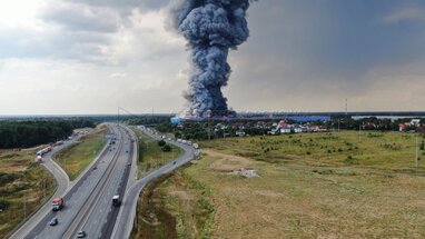 Вид с квадрокоптера на пожар на складе Ozon в городском округе Истра.
