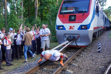 Установление мирового рекорда в силовом экстриме по буксировке железнодорожного состава в Подмосковье