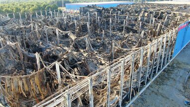Вид с квадрокоптера на последствия пожара на складе Ozon в Истре