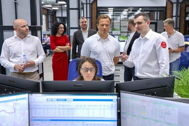 Заместитель мэра столицы по вопросам транспорта Максим Ликсутов (в центре) во время презентации Единого круглосуточного центра управления городским наземным транспортом Москвы.