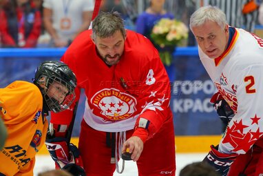 Хоккеист Александр Овечкин (в центре) и первый заместитель председателя комитета по физической культуре, спорту, туризму и делам молодежи Госдумы РФ Вячеслав Фетисов перед началом матча легенд в рамках турнира по хоккею Кубок Александра Овечкина на ледовой арене имени Владимира Петрова в Красногорске.