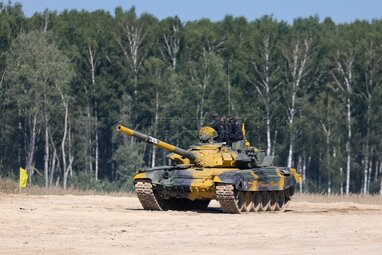 Танк Т-72Б3 команды военнослужащих Казахстана (слева) во время соревнования «Армейские международные игры - 2022» на военном полигоне «Алабино» в Московской области.