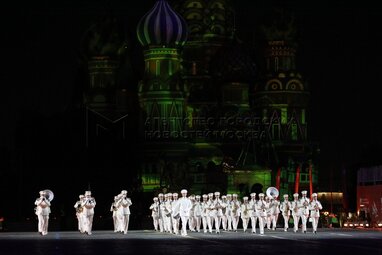 Центральный оркестр Военно-морского флота (ВМФ) во время вечернего представления в рамках пятого дня фестиваля «Спасская башня - 2022» на Красной площади.