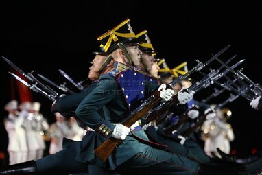 Рота почетного караула 154-го отдельного комендантского Преображенского полка во время вечернего представления в рамках пятого дня фестиваля «Спасская башня - 2022» на Красной площади.
