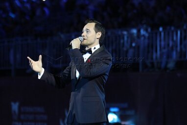 Солист мужского камерного хора Заиконоспасского монастыря «Благозвонница» и приглашенный солист Центрального военного оркестра Министерства обороны РФ Федор Рытиков во время вечернего представления в рамках пятого дня фестиваля «Спасская башня - 2022» на Красной площади.