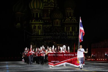Марширующий оркестр школы Бунваттана во время вечернего представления в рамках пятого дня фестиваля «Спасская башня - 2022» на Красной площади.