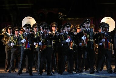 Оркестр Главного штаба Вооруженных Сил Республики Армения во время вечернего представления в рамках пятого дня фестиваля «Спасская башня - 2022» на Красной площади.