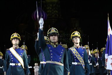 Центральный пограничный ансамбль ФСБ РФ во время вечернего представления в рамках пятого дня фестиваля «Спасская башня - 2022» на Красной площади.