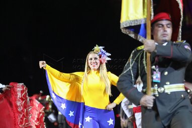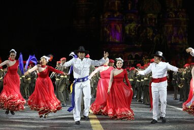 Танцевальный коллектив оркестра Вооруженных сил Венесуэлы во время вечернего представления в рамках пятого дня фестиваля «Спасская башня - 2022» на Красной площади.
