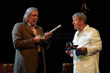 Актер Виктор Раков в роли Барклея Купера (слева) и Владимир Еремин в роли Левицкого (слева направо) во время показа в театре «Ленком Марка Захарова» премьерного спектакля «Последний поезд» в постановке Антона Яковлева.