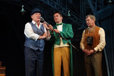 Актеры Виктор Раков в роли Барклея Купера, Владимир Еремин в роли Левицкого и Владимир Юматов в роли Ведущего (он же Хеннинг, он же Хоппер) (слева направо) во время показа в театре «Ленком Марка Захарова» премьерного спектакля «Последний поезд» в постановке Антона Яковлева.