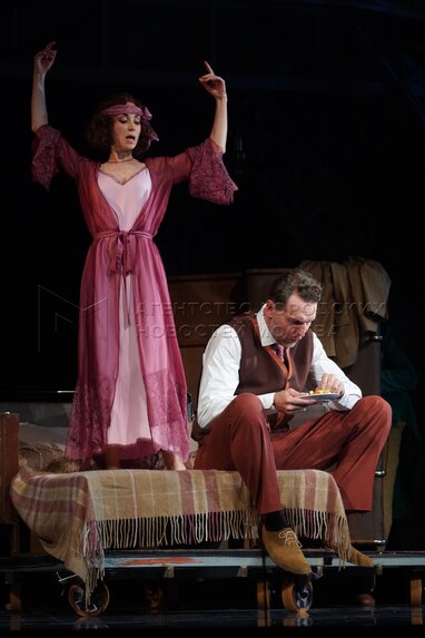 Актеры Анна Большова в роли Аниты и Сергей Пиотровский в роли Джорджа во время показа в театре «Ленком Марка Захарова» премьерного спектакля «Последний поезд» в постановке Антона Яковлева.