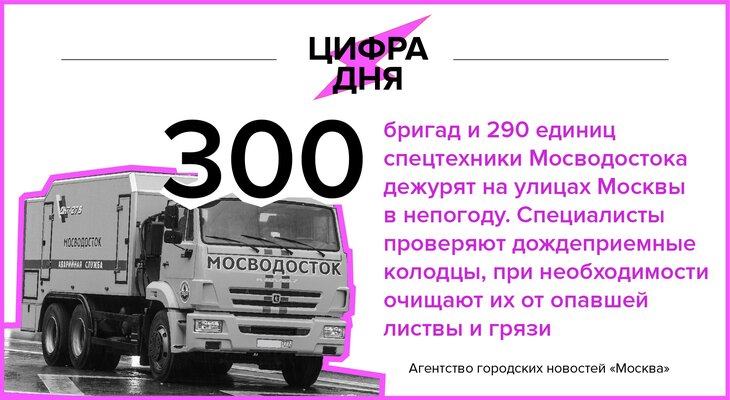 Цифра дня 19 октября: 300 бригад и 290 единиц техники Мосводостока дежурят на улицах Москвы в непогоду
