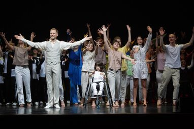 Ведущий солист балета Музыкального театра им. К. С. Станиславского и В. И. Немировича-Данченко Алексей Любимов, танцовщица Анна Блохина (на первом плане) и участники фестиваля после выступления на 10-м юбилейном международном благотворительном танцевальном фестивале Inclusive Dance в рамках форума «Доступная культурная среда» в «Крокус Сити Холле».