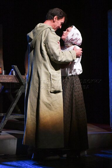 Актеры Игорь Лагутин в роли Пятого Теркина и Моряна Анттонен-Шестакова во время прогона спектакля «Василий Теркин» на сцене Московского академического театра сатиры.