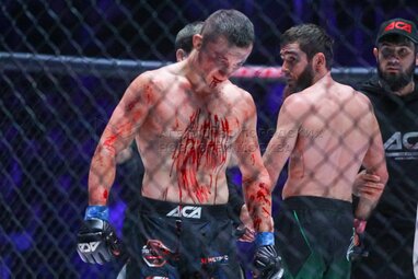 Российские бойцы смешанных единоборств Альберт Мисиков (слева) и Нашхо Галаев во время поединка на турнире ACA 147 в спорткомплексе «ЦСКА Арена».