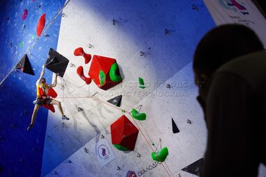 Финалы в дисциплине «лазание на трудность» на всероссийских соревнованиях «Кубок 75-летия скалолазания» в крытом легкоатлетическо-футбольном комплексе ЦСКА.