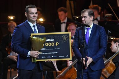 Генеральный директор АНО «ИРИ» Алексей Гореславский (справа) на торжественной церемонии вручения VIII Всероссийской премии «За верность науке» в Московском концертном зале «Зарядье».