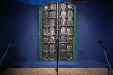 «Западные златые врата Рождественского собора» (1230-е г.) на предпоказе выставки «Великое княжество. Сокровища Владимиро-Суздальской земли» в выставочном зале в здании Государственной Третьяковской галереи на ул. Крымский Вал.